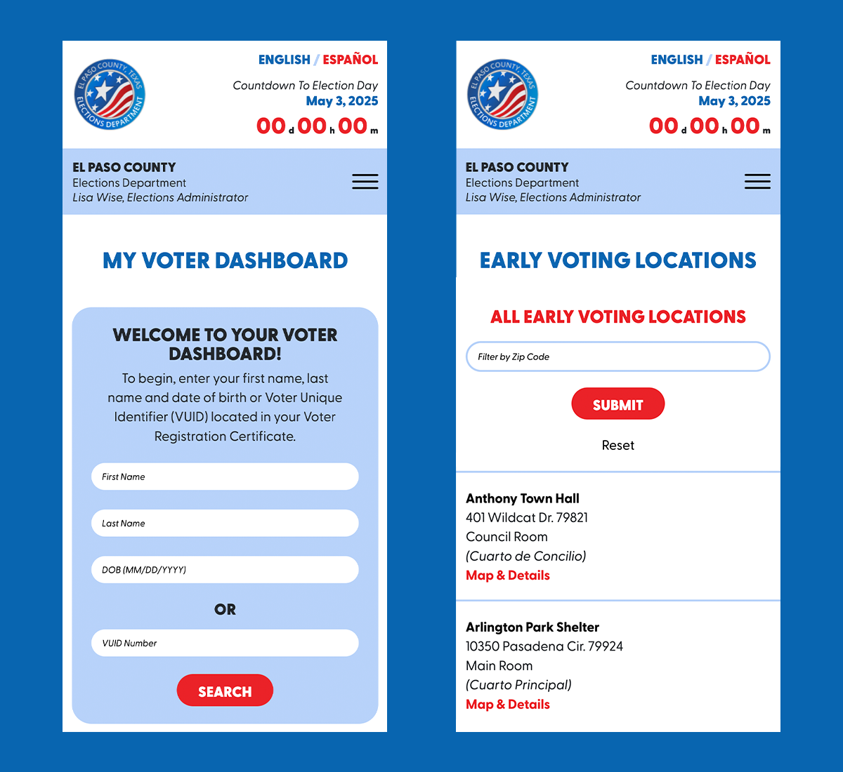 El Paso County Elections partnered with us to modernize their digital voter experience and expand access to critical election information. The new website and mobile app needed to serve a diverse community, support multilingual users, meet WCAG accessibility standards, and scale across future election cycles. The goal was simple: make it faster and easier for every voter to participate, stay informed, and navigate the election process with confidence.