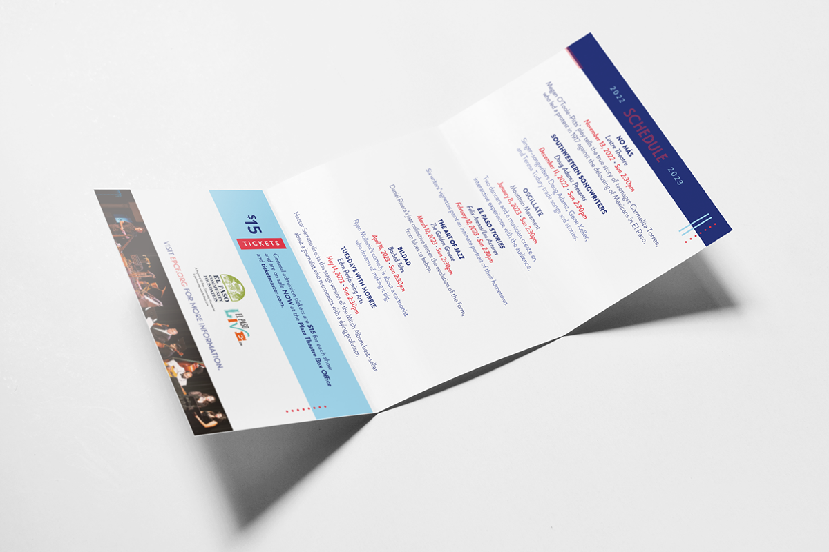 I designed posters, trifold brochures, and custom playbills for each show, ensuring consistent branding across all pieces while allowing room for unique visual elements that matched each performance’s tone. The materials were distributed at community venues and featured in local press, extending reach beyond the core audience.