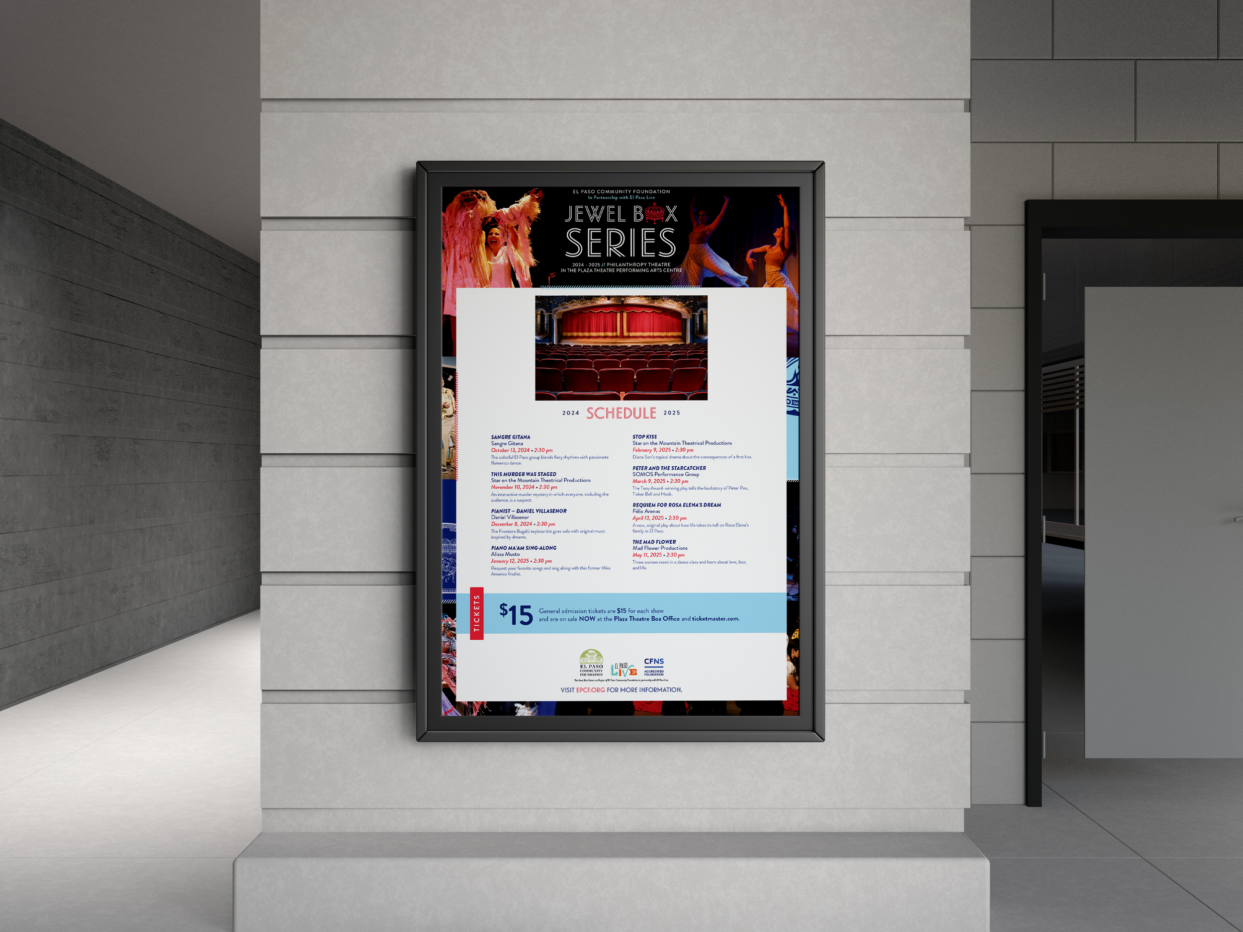 The Jewel Box Series, a local performance series, needed branding and promotional materials to increase awareness and attendance. The goal was to create visually engaging designs that reflected the variety and artistry of the performances while maintaining a cohesive season identity.